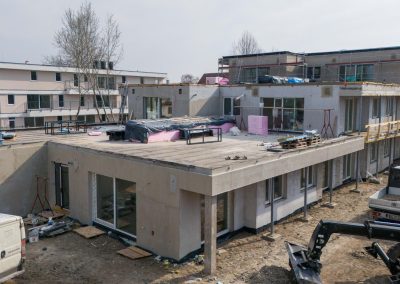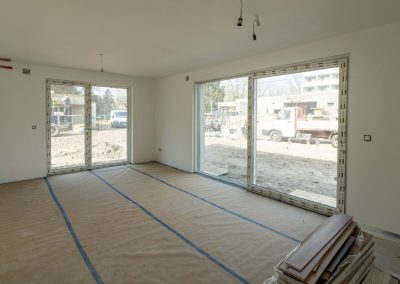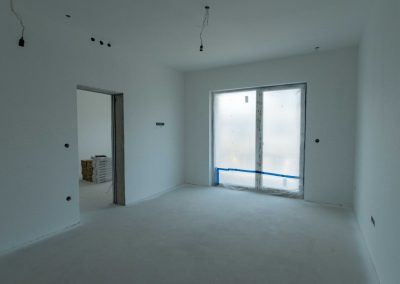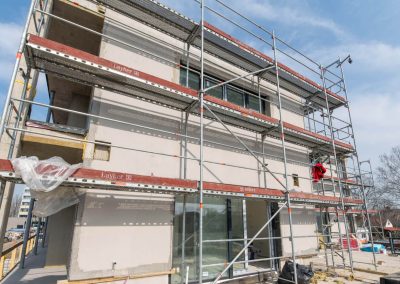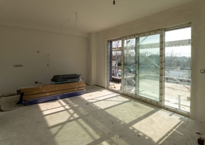 A „B” épület kivitelezése párhuzamosan halad az „A” épülettel. A homlokzati hőszigetelési munkák itt is közel járnak a befejezéshez, a lakásokban pedig szintén a belső befejező munkálatok zajlanak. A festések és burkolások előrehaladtával egyre jobban kirajzolódik, milyen hangulat várja majd a leendő tulajdonosokat.